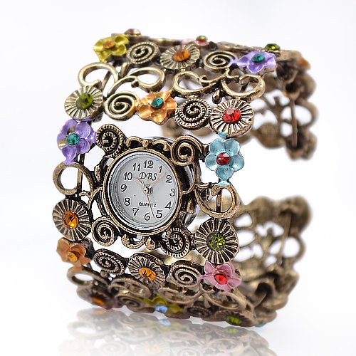 Gorgeous and lovely design, different from other similar products, the watch is decorated with multicolour brilliant rhinestone, very beautiful product for lady accessory. * Cultivate a glamorous look with the openwork flower-design * Cute flower's core is decorated with multicolour crystals * Silver color mother-of-pearl dial with silver color hour, minute, and second hands * Black arab numbers hour markers make it is easy to read * Durable stainless steel watchcase * Precision Japan quartz movement * Daily water resistance Specification: * Bracelet Length: 21cm * Bracelet Width: 4.5cm * Case Size: 2.1cm X 2.1cm Package Includes: 1 x Bracelet Watch