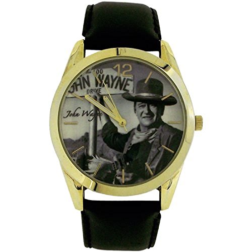 A classy dress watch by John Wayne, this is a smart gents wrist watch that functions to a high capacity, perfect for casual wear. A man ought to do what he thinks is right by the American Legend. This watch is an ideal gift for him. Product Features: * Quartz movement. * Image of John Wayne on dial and numbers. * Hour, minute and second hand. * Goldtone metal casing and buckle. * Black leather strap. * Splash proof. * Stainless steel case back. Strap Measurements: This watch fastens with a buckle on any of the 7 holes. * Length from one end of the strap to the other: 24cm. * Length when fastened on the tightest hole: 16.5cm. * Length when fastened on the loosest hole: 21cm Also Comes With: * Manufacturers guarantee. * Presentation box.