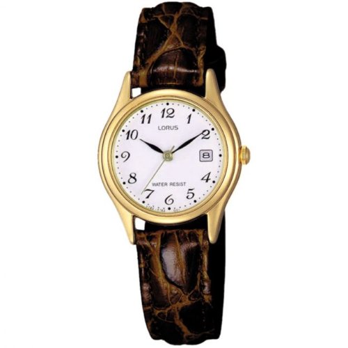 Elegant Lorus watch featuring a PVD gold-plated case, white dial with date function and numeral markers, and a brown leather strap.