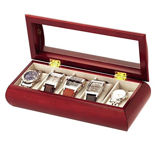 Key featuresA perfect gift for any watch collector. The classic name of Mele & Co is proud to present this cherry finished watch holder, the wooden style compliments any room and will fit nicely on any dresser or table. The elegant cherry effect finish brings some added sophistication and character. The box has a large glass window on top to see into the compartments that can hold up to five watches, keeping your favourite watches organised and close to hand. Measurements28 x 11 x 9cms ApproxBrand : MeleMaterial : WoodColour : cherryDimensions : 28 x 11 x 9cmsNo. of items : 1Consists of : 5 Watch HoldersFinish outer : CherryGift box : YesNo. of drawers : 0