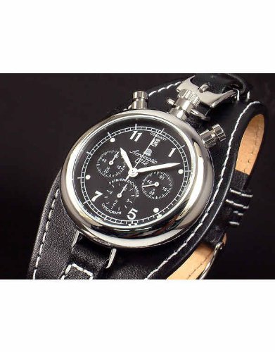 stainless steel case case diameter 40 mm / thick 10,5mm special hardened mineral glass lumious "central" minute and hour hands luminous numbers 5 ATM (150 ft.) water resistant high quality movement screwed bottom high quality leather strap with thorn buckle band usefull for max. arm extent 240mm 6 hands chronograph with stopping functions date on position "12" crown diameter 6 mm