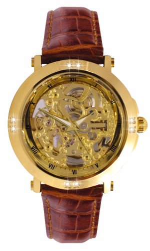 This Sekonda automatic watch features a round PVD Gold plated case with an exhibition case back and a handsome gold-coloured dial. This classy looking model features Roman numerals and has a brown genuine leather strap. It is powered by an automatic movement and has 8 genuine diamonds set in the case border.